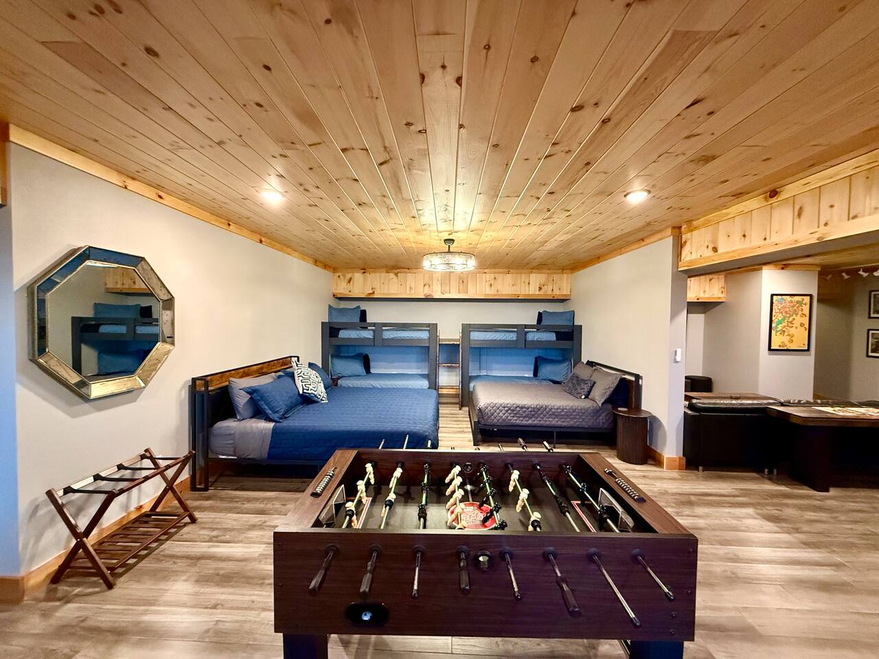 The home features the following spaces: Great Room (Kitchen, Living Room) Formal Dining Breakfast Nook Master Bedroom (King, TV, Audio System) Master Bath (Shower, Soaking Tub) Master Closet (Laundry) Bedroom 1 (King) Bedroom 2 (King) Bedroom 3 (King) Bedroom 4 (2 Queen) Hall Bath (Shower, Dual Commode) Bedroom 5, Basement (2 XL Twin) Bunk Area, Basement (1 King, 1 Full, 4 XL Twin) Basement Living/Game Room (TV) Office, Loft (Printer, Docking Station, Monitor, Keyboard+Mouse, 1 Full Bed) Loft Sitting Room (TV, Arcade Games)