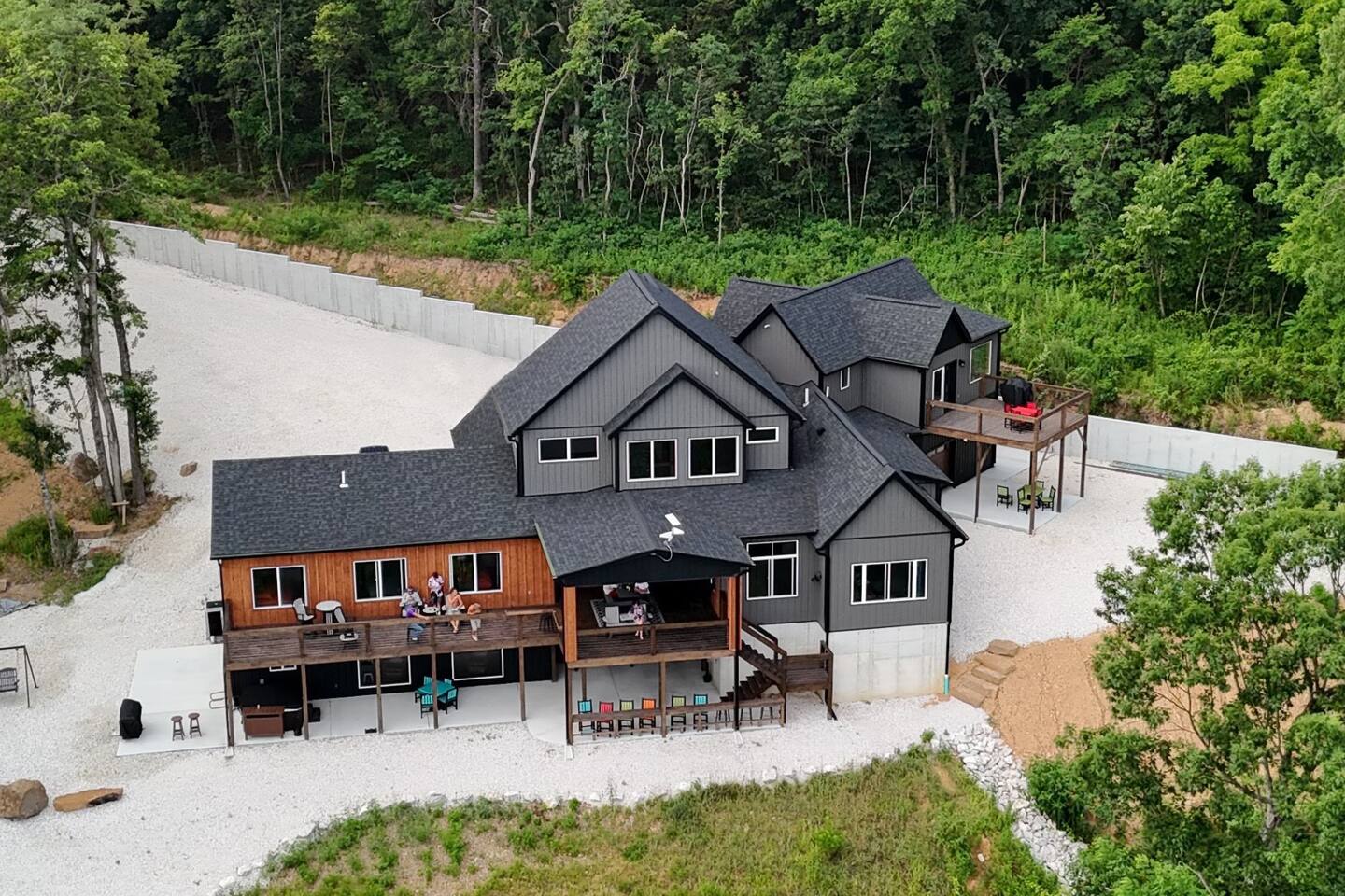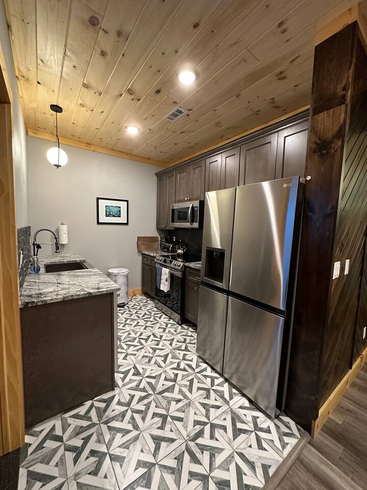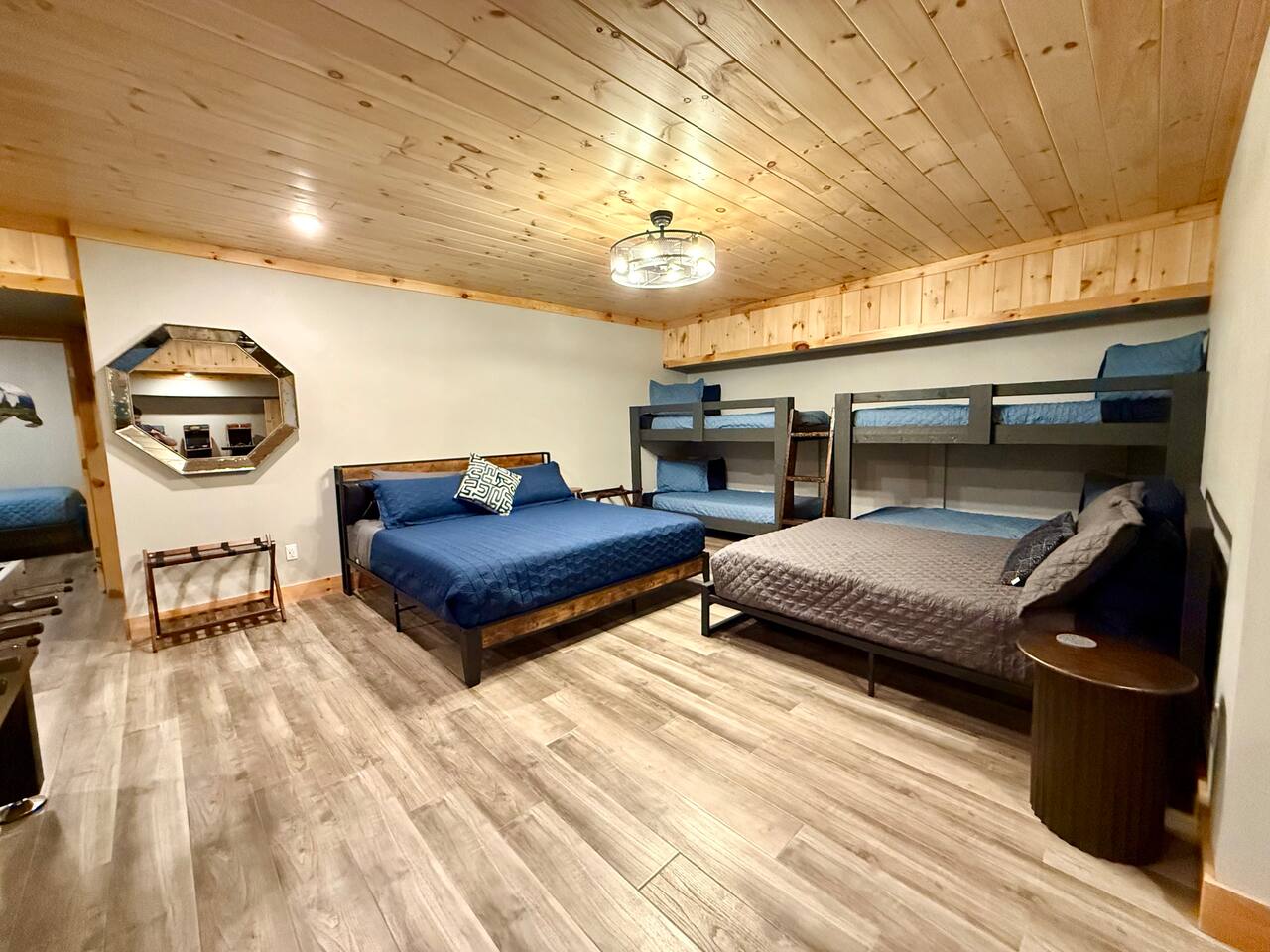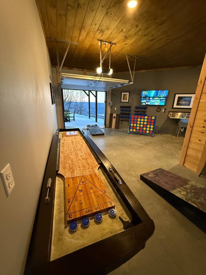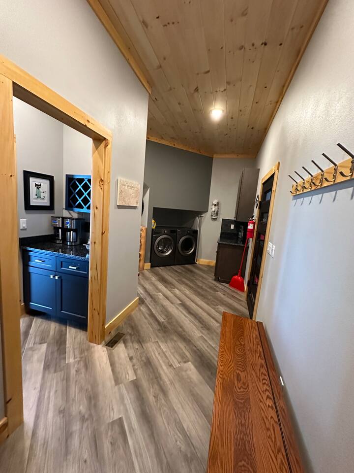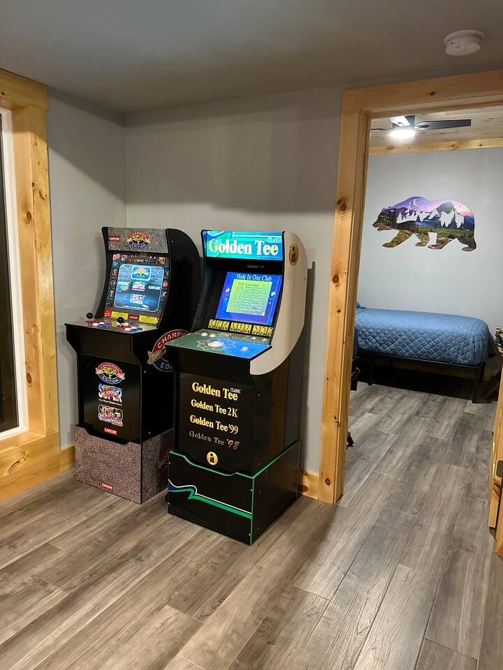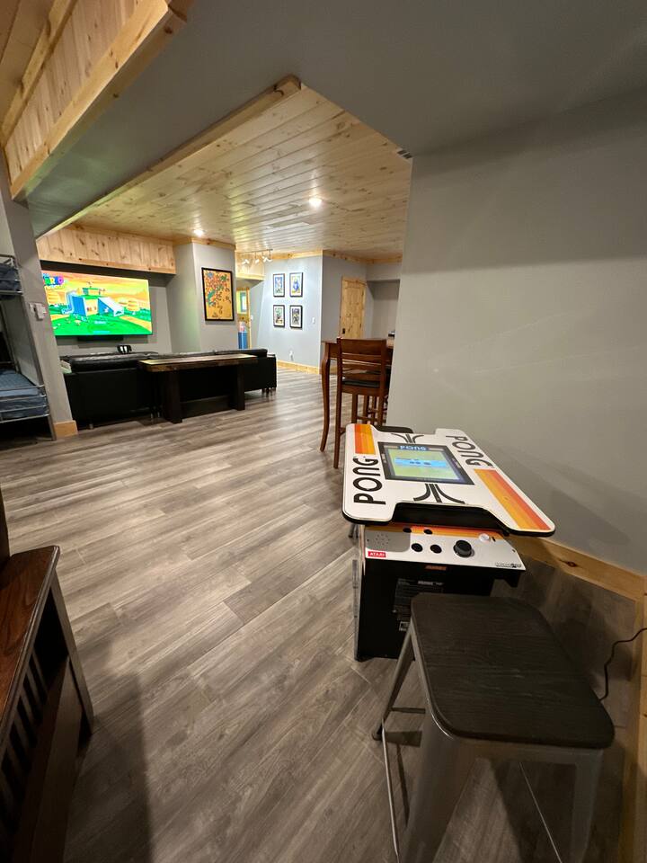 The home features the following spaces: Great Room (Kitchen, Living Room) Formal Dining Breakfast Nook Master Bedroom (King, 75" TV, In-ceiling Audio System) Master Bath (Shower, Soaking Tub) Master Closet (Laundry) Bedroom 1 (King) Bedroom 2 (King) Bedroom 3 (King) Bedroom 4 (2 Queen) Hall Bath (Shower, Dual Commode) Bedroom 5, Basement (2 XL Twin) Bunk Area, Basement (1 King, 1 Full, 4 XL Twin) Basement Living/Game Room (85" TV, Arcade Games) Office, Loft (Printer, Docking Station, Monitor, Keyboard+Mouse, Full Size Bed) Loft Sitting Room (85" TV) The private apartment features the following spaces: -Master bedroom w/ king size bed -Bathroom with tile shower and lighted mirror -Full kitchen with stainless steel appliances -Washer and dryer -75" TV with SpeakerCraft audio -Leather "stressless" recliners and futon in living room