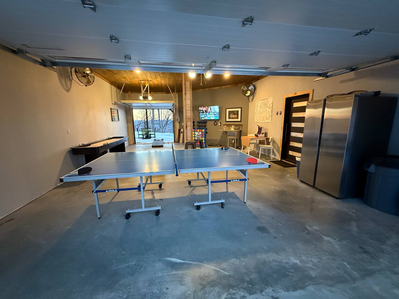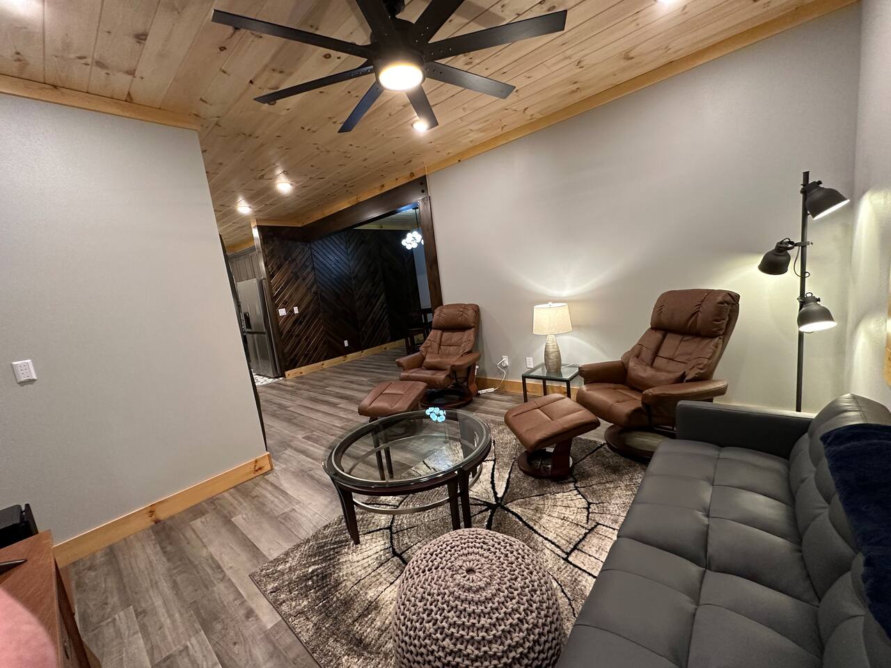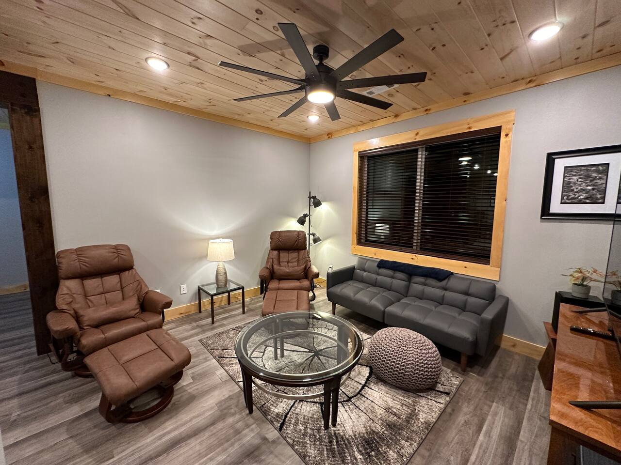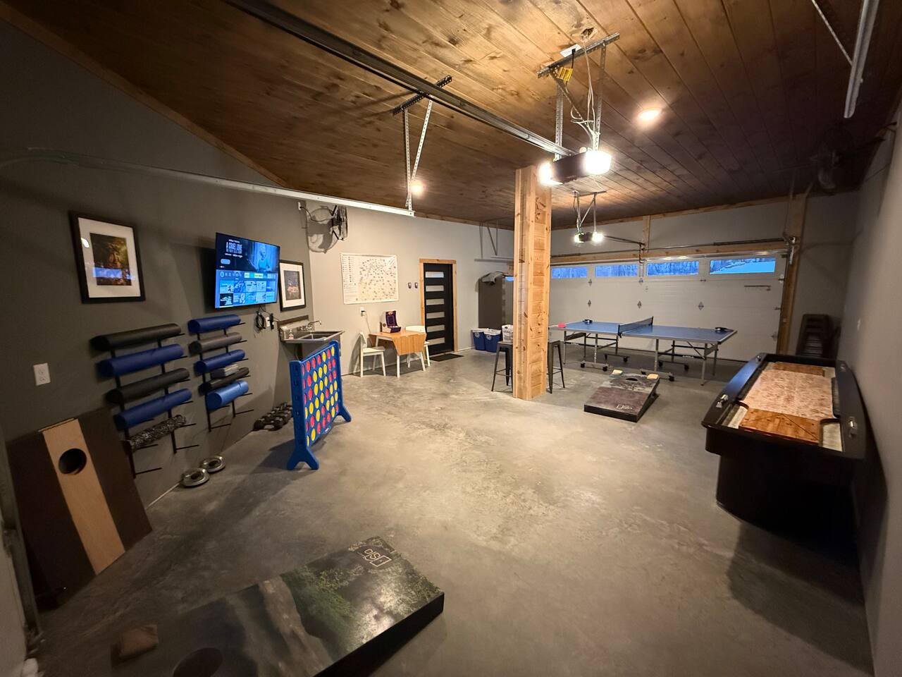 The home features the following spaces: Great Room (Kitchen, Living Room) Formal Dining Breakfast Nook Master Bedroom (King, 75" TV, In-ceiling Audio System) Master Bath (Shower, Soaking Tub) Master Closet (Laundry) Bedroom 1 (King) Bedroom 2 (King) Bedroom 3 (King) Bedroom 4 (2 Queen) Hall Bath (Shower, Dual Commode) Bedroom 5, Basement (2 XL Twin) Bunk Area, Basement (1 King, 1 Full, 4 XL Twin) Basement Living/Game Room (85" TV, Arcade Games) Office, Loft (Printer, Docking Station, Monitor, Keyboard+Mouse, Full Size Bed) Loft Sitting Room (85" TV) The private apartment features the following spaces: -Master bedroom w/ king size bed -Bathroom with tile shower and lighted mirror -Full kitchen with stainless steel appliances -Washer and dryer -75" TV with SpeakerCraft audio -Leather "stressless" recliners and futon in living room